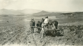 Images from the Maggie Belle Loesch Photo Collection, taken between 1919 and 1924, donated to MHS by Dave Eslick: Clockwise from top left—Plowing the high fields, Bailing hay, Standing on the bailer, Bailing hay, the MH Schoolhouse in 1919, Gathering spuds in 1921.
